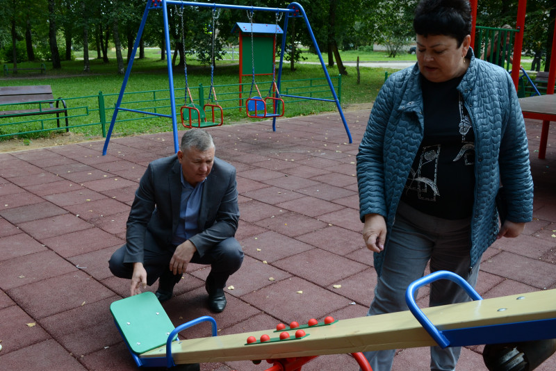 Глава округа А. В. Голуб проверил благоустройство детской площадки в деревне Плоское.