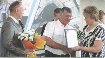 На фото Главный федеральный инспектор в Смоленской области О.В. Окунева поздравляет генерального директора ООО "Родник" С.П. Шапкина с победой в конкурсе "Предприниматель года".